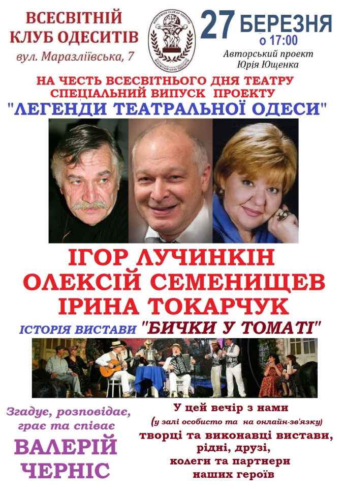 27 березня, у Всесвітній день театру, у Всесвітньому клубі одеситів відбувся особливий вечір авторського проєкту Юрія Ющенка «Легенди театральної Одеси», присвячений пам’яті Ігоря Лучинкіна, Олексія Семенищева та Ірини Токарчук.